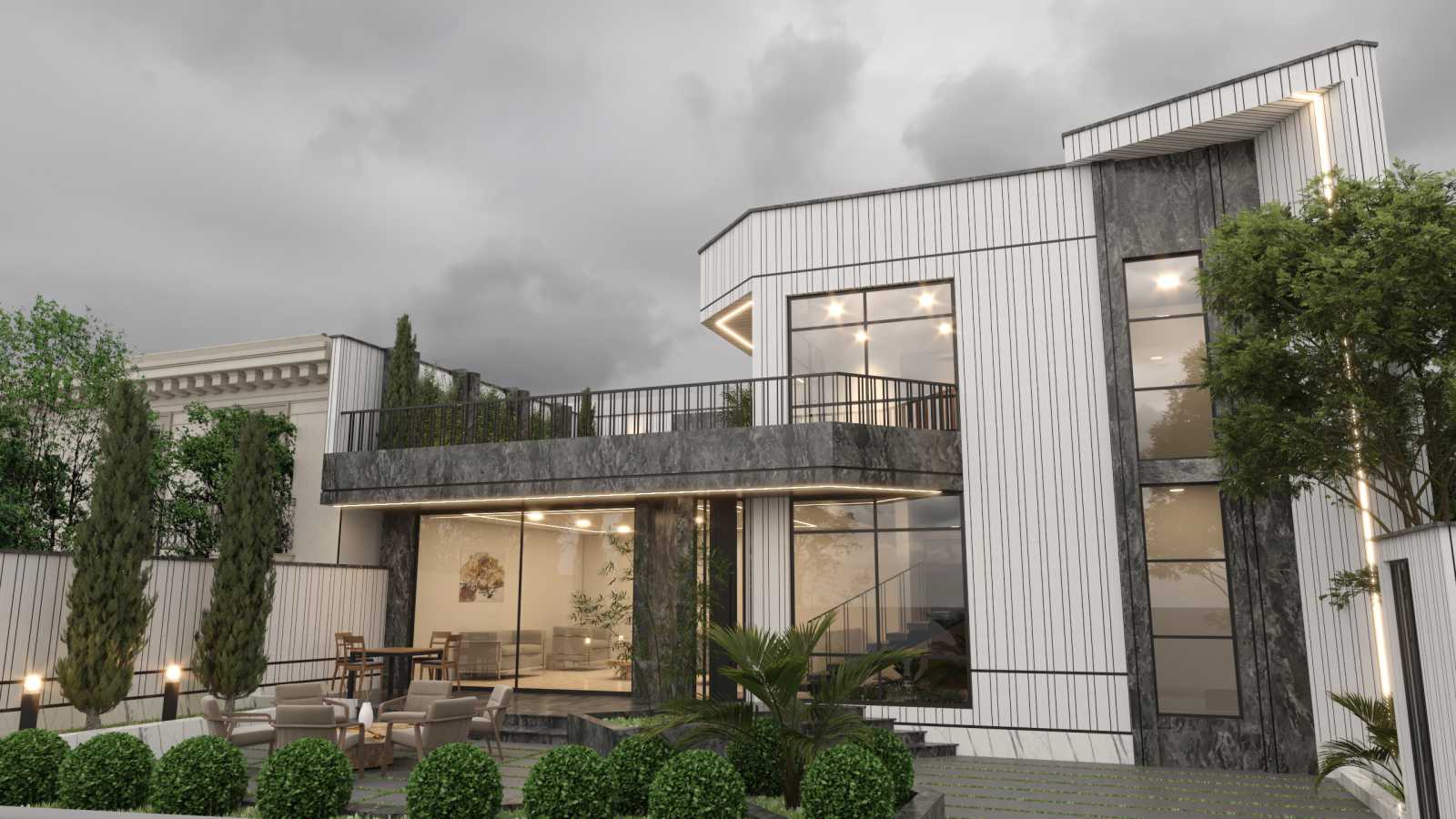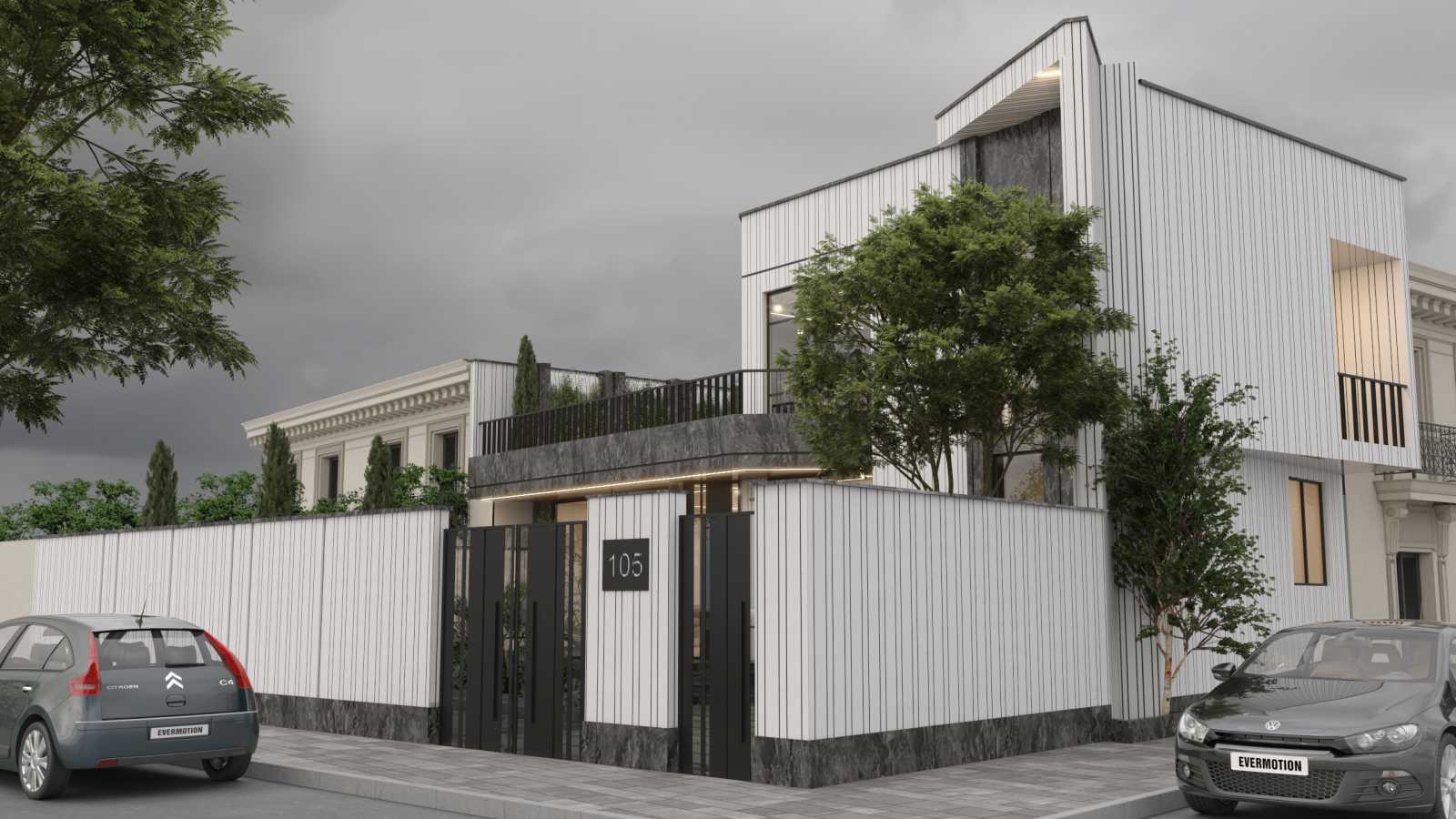 The volumetric design and lines of this building started from the edges of the existing condition of the project land, and during the course of the plan design, with the effort we had to correct the angles and angles of the land, we gradually extended the interior lines to the courtyard, and by continuing these lines and fractures, we formed the volume of the building. As a result, the interior spaces were born without angles and in accordance with the client's wishes, and the volume of the building was coordinated with the landscaping lines by adding a form on the facade.