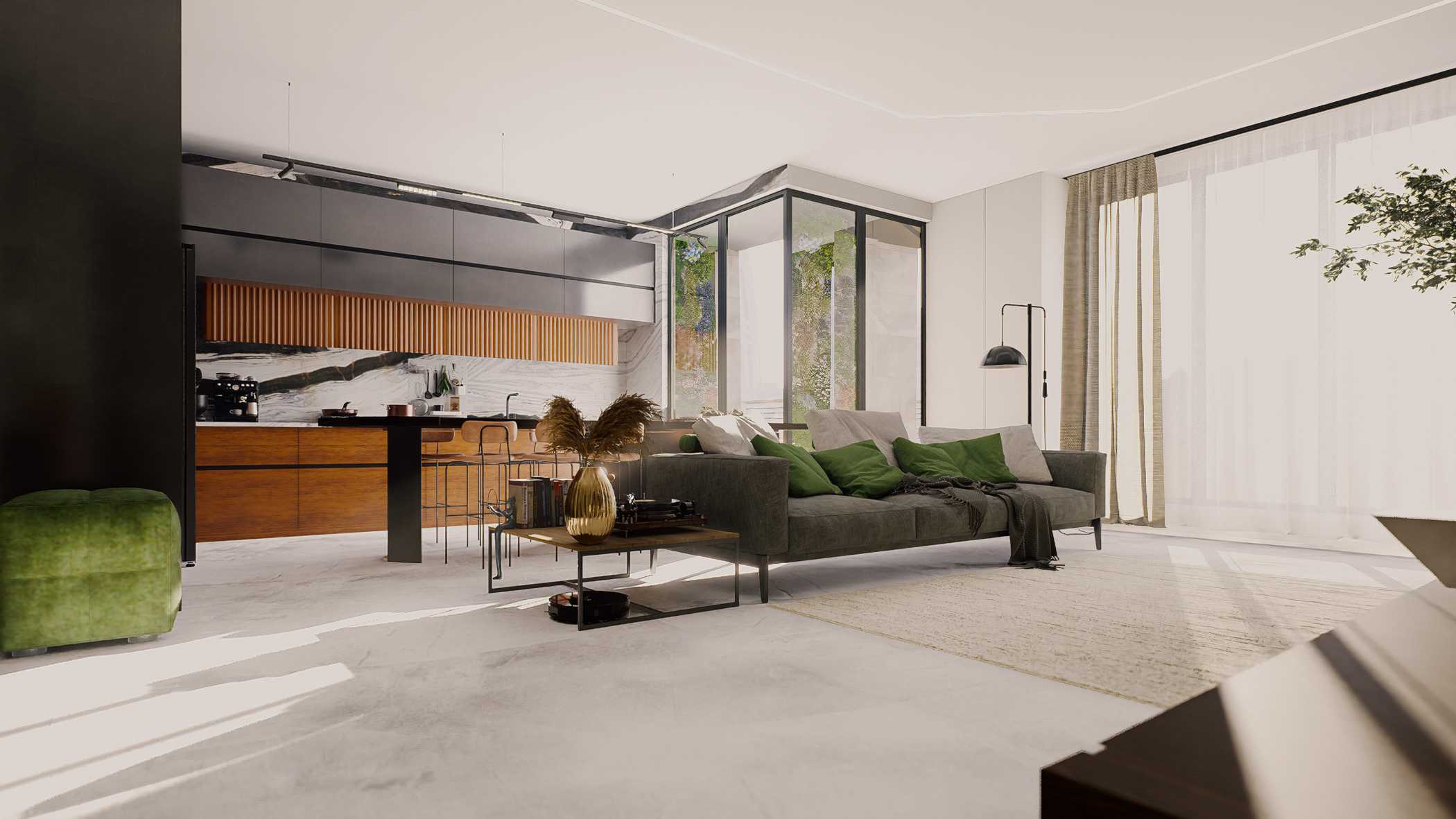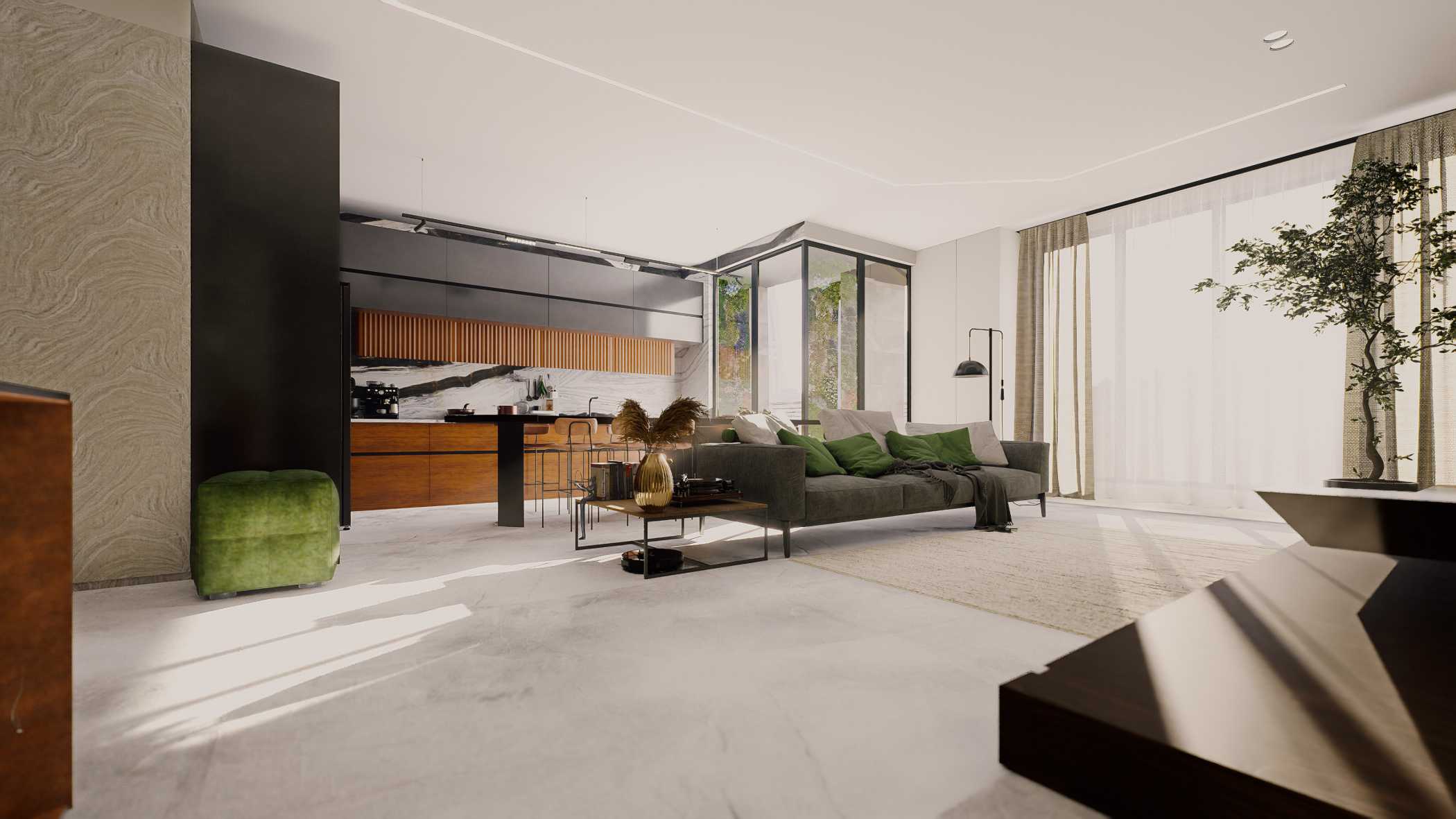 Warm and intimate colors, along with matte black and red woods, have created a distinctive and characterful space; where the countertop made of tree trunks directly brings the texture of nature into the space, and the mirrors have expanded the visual boundaries by reflecting light and form. The greige-toned walls, green cushions and metal table bases are a combination of roughness and softness, which together create a narrative of contemporary life; a life that flows between geometric lines, raw materials and contact with nature.
