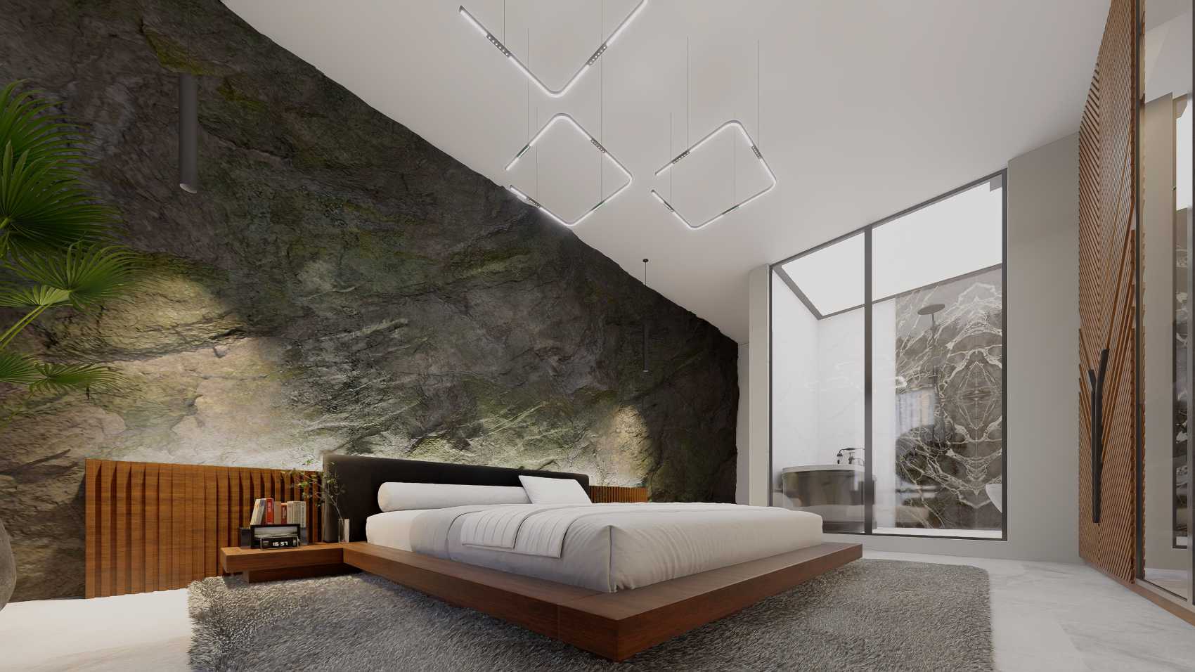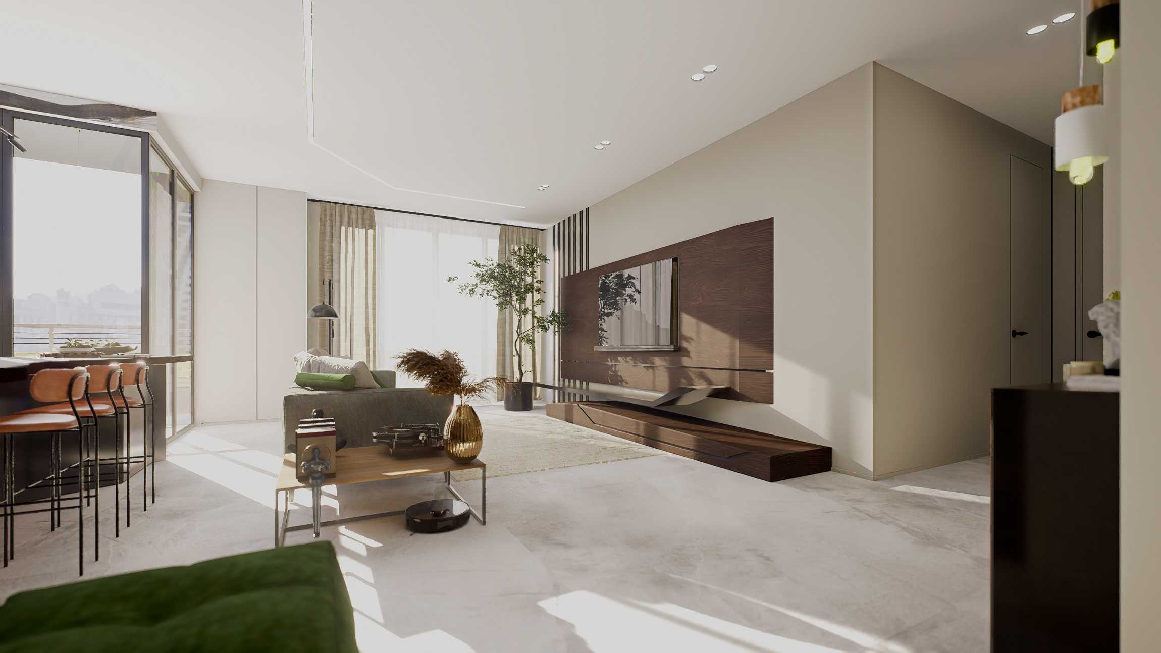While the large window of the hall and the terrace full of plants invite the fluidity of natural light inside, a balance is formed between the harshness of the form and the softness of nature. The flat ceiling is a calm bed for the play of light and form, allowing the built forms underneath to express themselves.