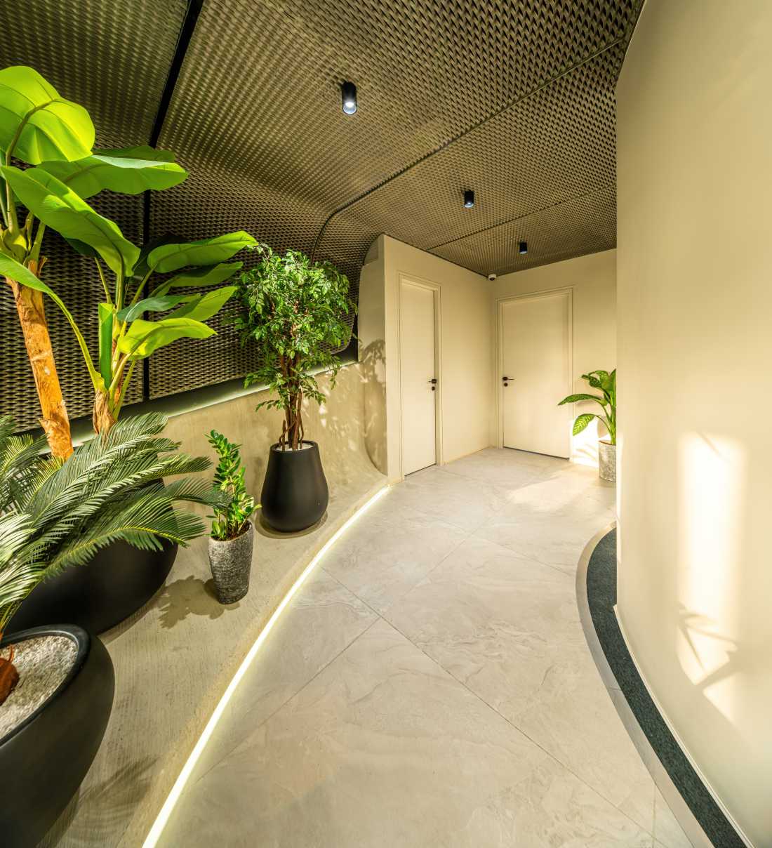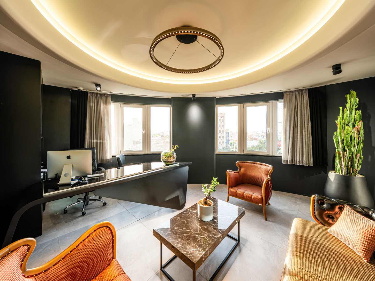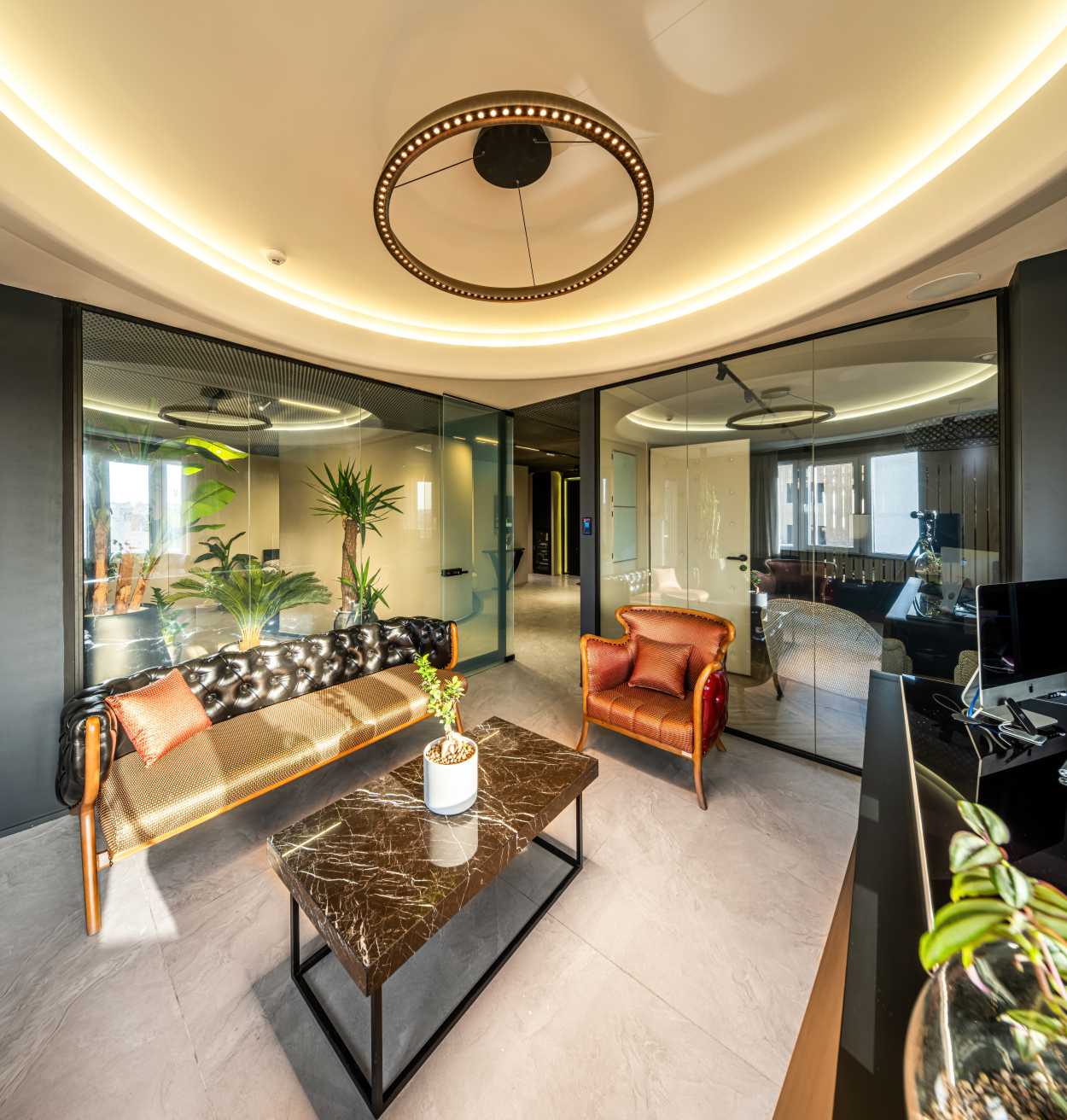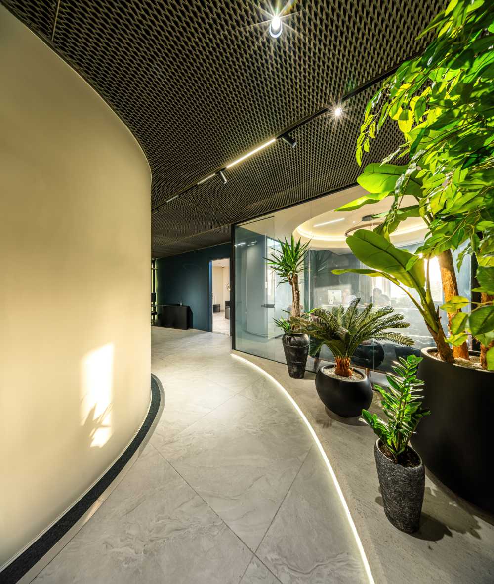 The use of new colors, circular forms in the middle of the space, and the use of soft lines in surfaces and furniture, dividing the space with smart glass, the effective presence of plants, textured surfaces, and the use of metal elements were the tools used to achieve the goal.